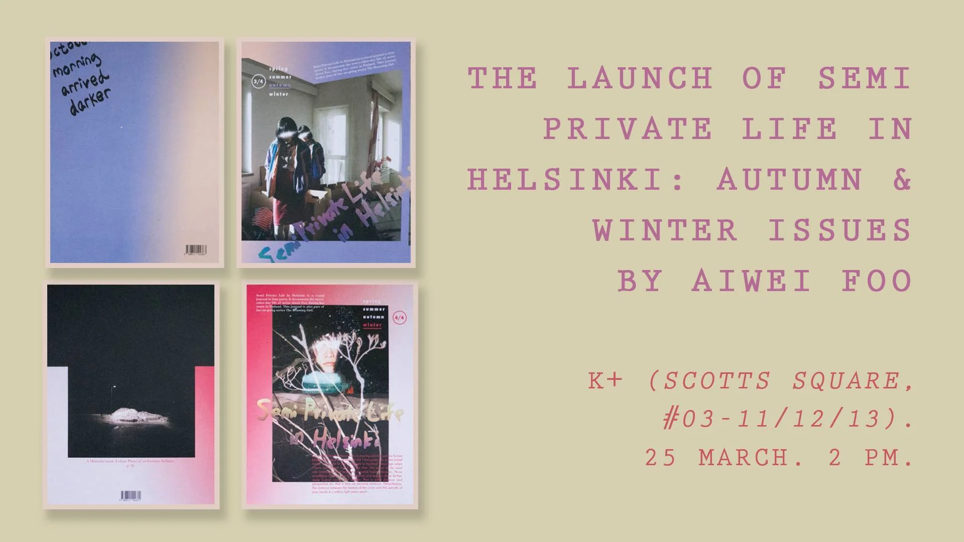 BooksActually is proud to present the launch of artist Aiwei Foo's latest publication, Semi Private Life in Helsinki: Autumn & Winter. Held at K+ on 25 Mar 2017, consider this a rare and unique opportunity to hear the artist talk about her work.