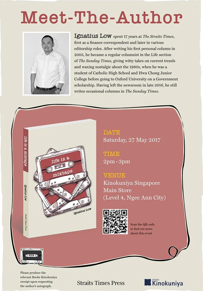 Come meet, greet and hear Ignatius Low talk about his new book, Life is a Mixtape, in a dialogue moderated by Fiona Chan, the Managing Editor of The Straits Times.