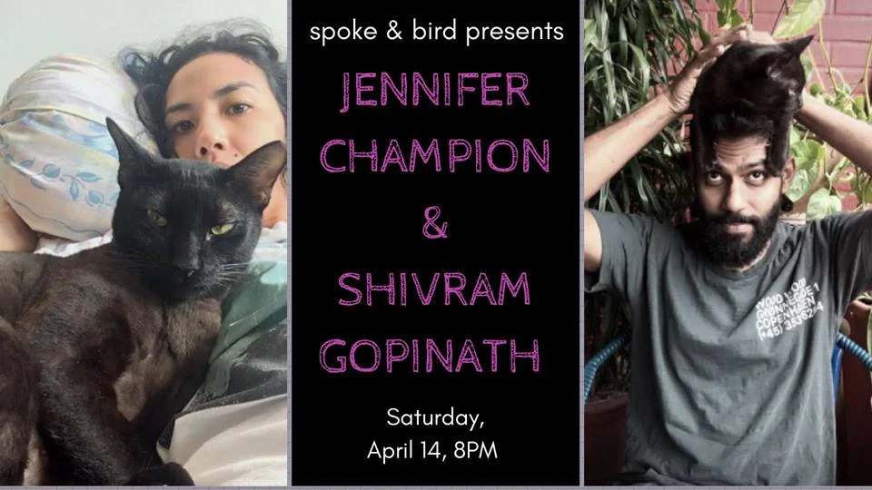 Smack in the middle of Singapore Poetry Writing Month, Spoke & Bird #9 bring you a double whammy of poetic awesomeness, featuring for the first time not one but TWO epic local poets & black cat owners: JENNIFER CHAMPION and SHIVRAM GOPINATH. Veterans of the poetry/spoken word scene since the early 2010s, these two powerhouses, each with their own unique style, will bring you an absolutely unmissable, unforgettable night.