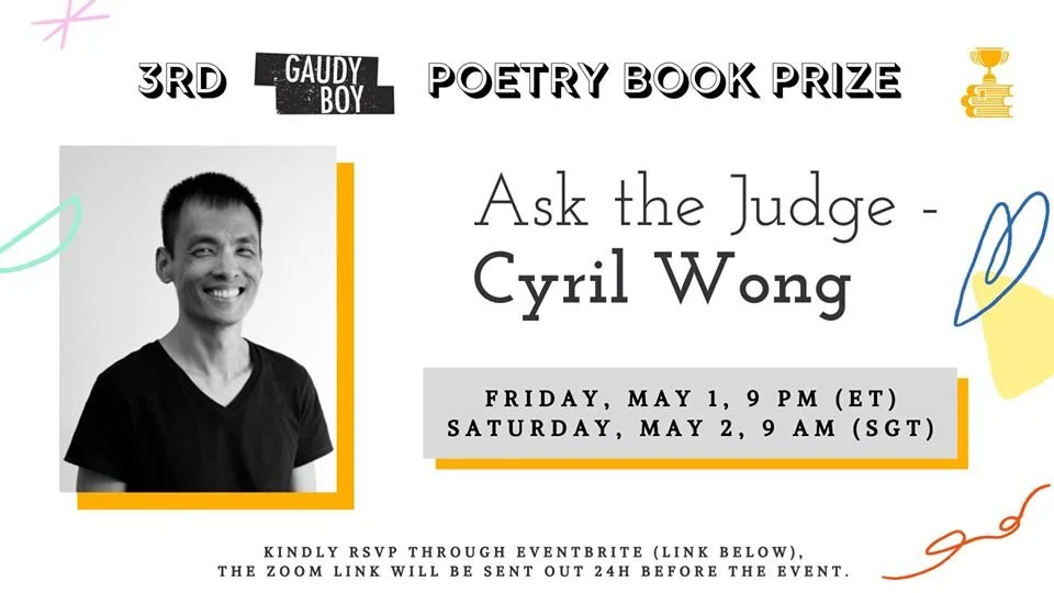 Join Singapore Unbound for a very special 30-minute interview with Cyril Wong, the judge for our 3rd Gaudy Boy Poetry Book Prize. You'll hear Cyril read from his work, go straight into a quick Q&A, and then open up the floor to questions from the public. We hope you come with all the questions you've been dying to ask Cyril: what he looks for in a poetry manuscript, his thoughts on the poetry currently coming from Asia and America, his creative process during the lockdown, etc.!