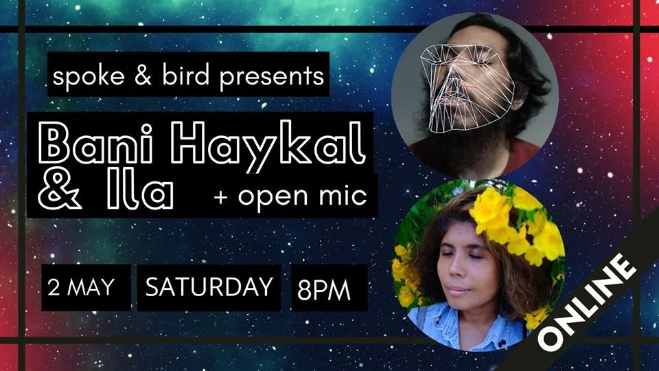 The open mic / spoken word series is returning on 2 May 2020 in an online format: streaming our show on FACEBOOK LIVE on the Spoke & Bird Facebook Page, and are SUPER EXCITED for our features, the incredible poet/musician/artist duo Bani Haykal & Ila!