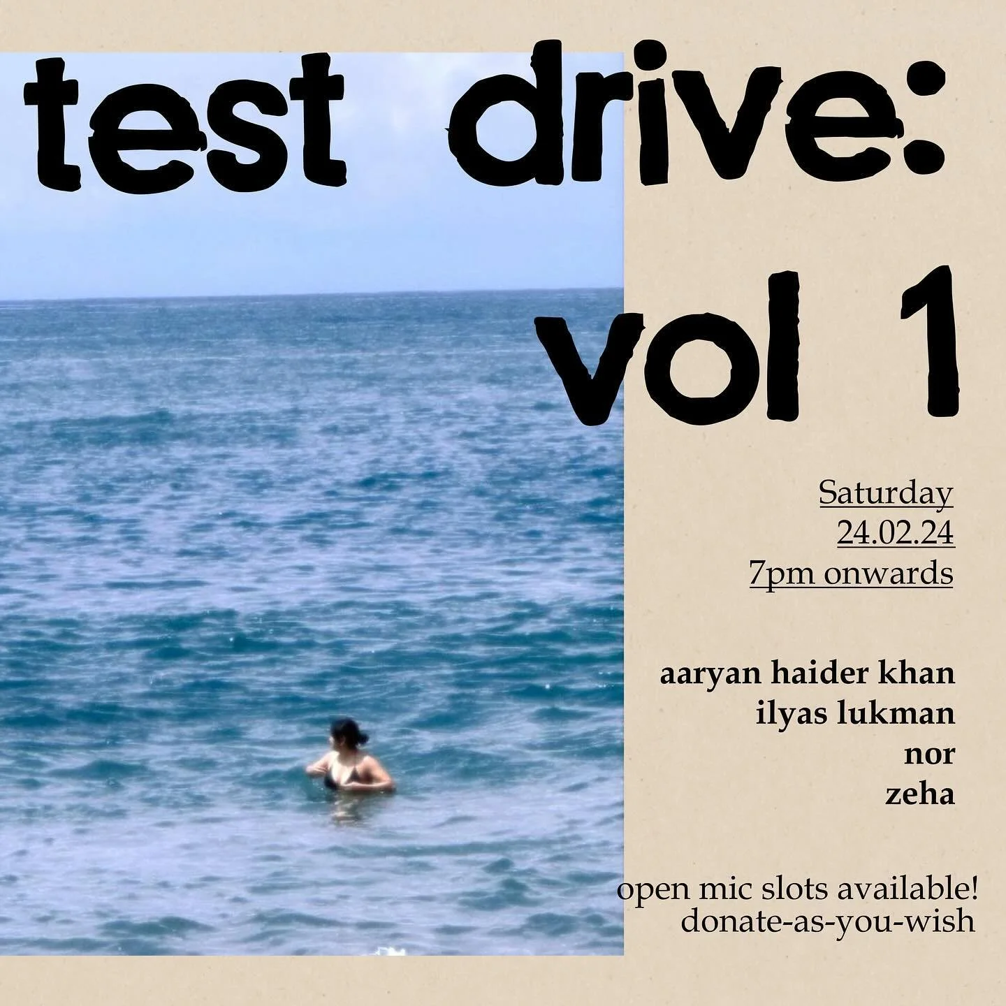 Test Drive Vol #1 is an evening of spoken word poetry featuring performances from nor, Zeha, Iyas Lukma and more. With open mic slots available, this event does not have an admission fee but donations are encouraged.