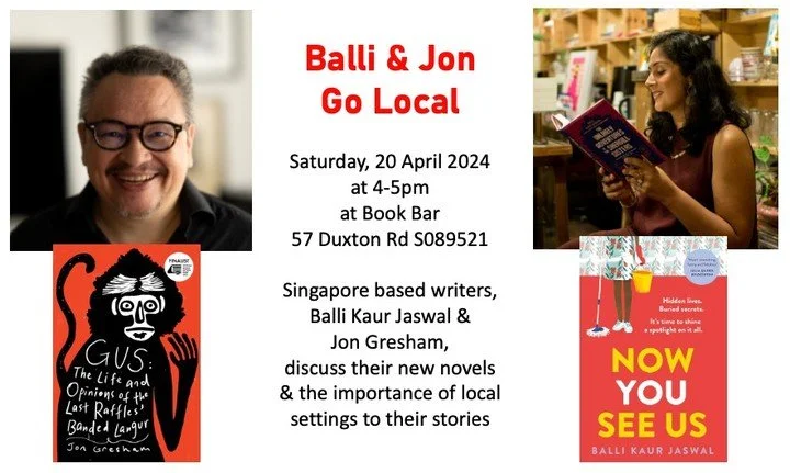 Join us Singapore based writers, Balli Kaur Jaswal & Jon Gresham, as they both talk about their new novels (Gus: The Life & Opinions of the Last Raffles Banded Langur & Now You See Us) and the importance of their settings in Singapore neighbourhoods.