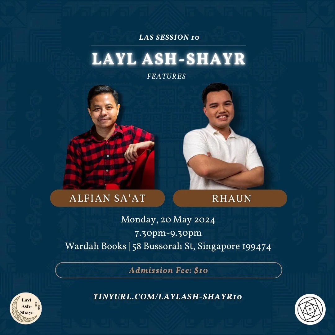 For their 10th open mic, Layl Ash-Shayr is excited to feature Alfian Sa'at and RHAUN as we commemorate Labour Day and Mother's Day.